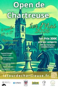 9 rondes en 15’+5’’, tournoi principal ouvert à tous et tournoi accession pour les -1600 Elo (pas de limite d’âge).